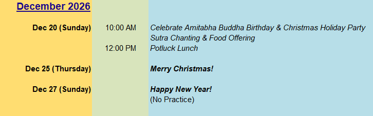 10:00 AM Celerbate Chndhi Bodhisattva Birthday and Food Offering 12:00 PM Potluck Lunch