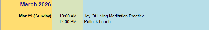 10:00 AM Joy Of Living Meditation Practice 12:00 PM Potluck Lunch
